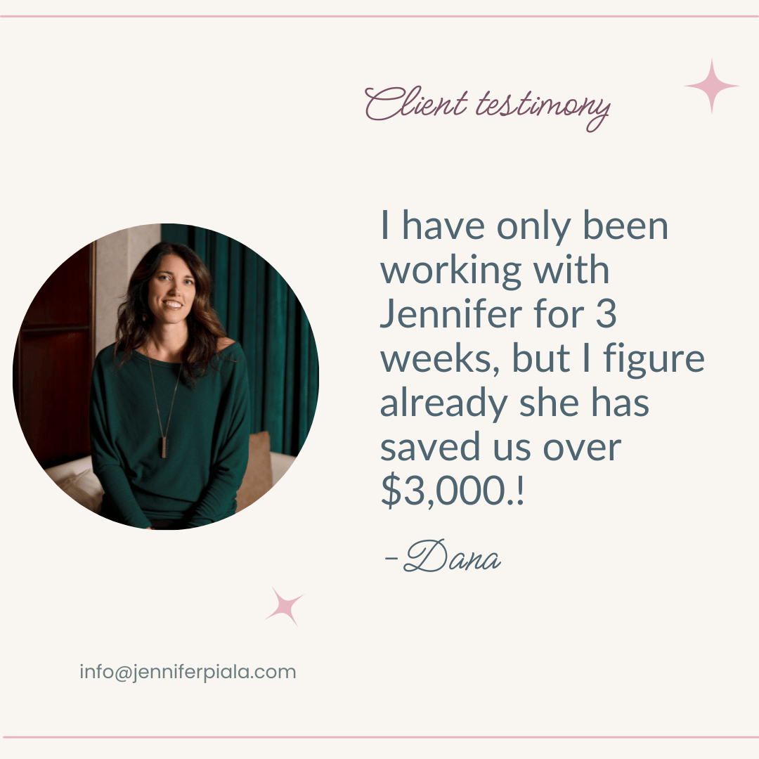 I was also surprised that in just a few weeks working together, Jen helped me save over$10,000 ! I highly recommend this experience to any woman who wants financial peace.”